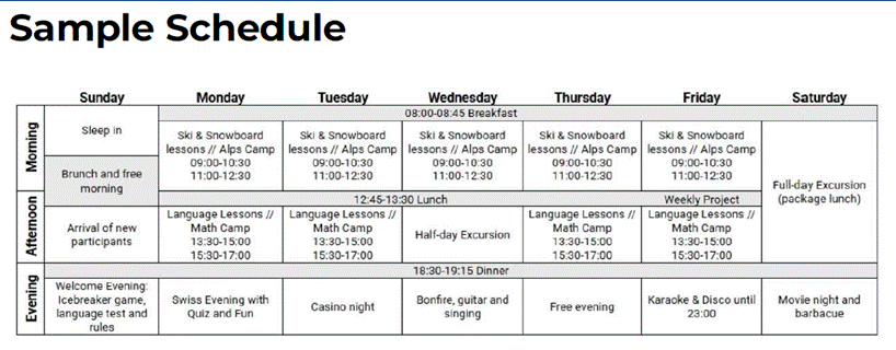 - Two excursions per week. One half-day excursion on Wednesday and one full-day excursion on Saturday